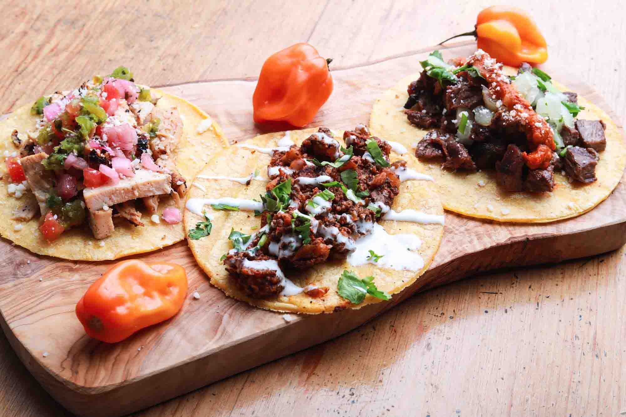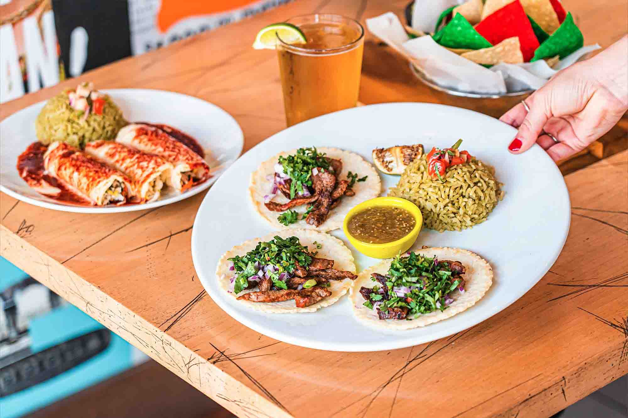 Three soft flour tortillas with your choice of grilled chicken breast or grilled steak sautéed with onions and bell peppers. Topped with shredded cheddar cheese. Served with Mexican rice and black beans on the side.